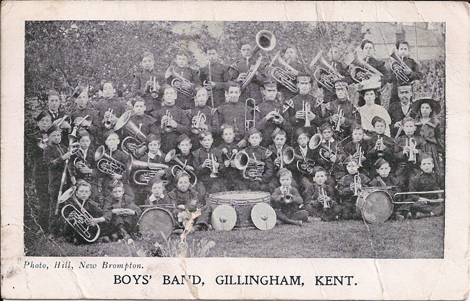 So with all this activity in Gillingham, I expected the history of this boys' band would be easy to find. Alas it is lost, at least on the internet. If they were from a school, that information would usually be preserved, and in this era such a large school band would be very unusual. They might be from a workhouse, that Dickensian institution where the impoverished were given room and board in exchange for their labor, and workhouse boys were sometimes organized into a band. Though there was a small workhouse in Chatham, the boys in the photo seem too well fed and too numerous to be that kind of band.