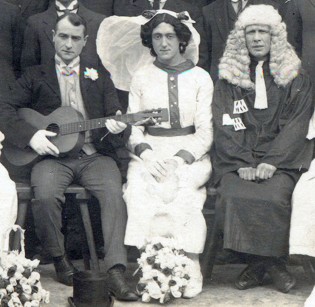 Behind the band are a number of pedestrians gawping at the camera, as this postcard came from the