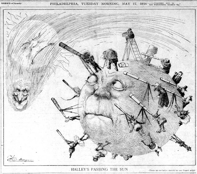 On May 19th, the day after the earth had passed through the comet's tail, newspaper headlines complained of its failure to produce any display of pyrotechnics. They seemed disappointed in the comet's lame performance and dissatisfied that the world had not come to a sad end. "Comet's Tail Plays Trick, Fails to Sweep the Earth" reads one headline.