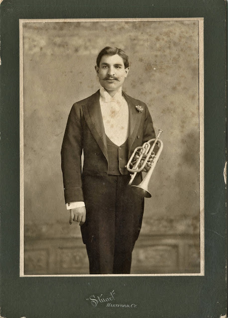 My third well-dressed cornetist is from Hartford, Connecticut where he posed with his instrument at the Stuart photography studio. His mustache has a tiny bit of an upturned curl that I think hints of a Germanic heritage, but that could just be a false twist. In 1890 Hartford was over twice the size of San Jose or Fond du Lac with a population then of 53,230. From 1874 to 1891 Hartford was the home of  Samuel Clemens/Mark Twain so it's possible that Sam might have heard this cornetist play in concert.